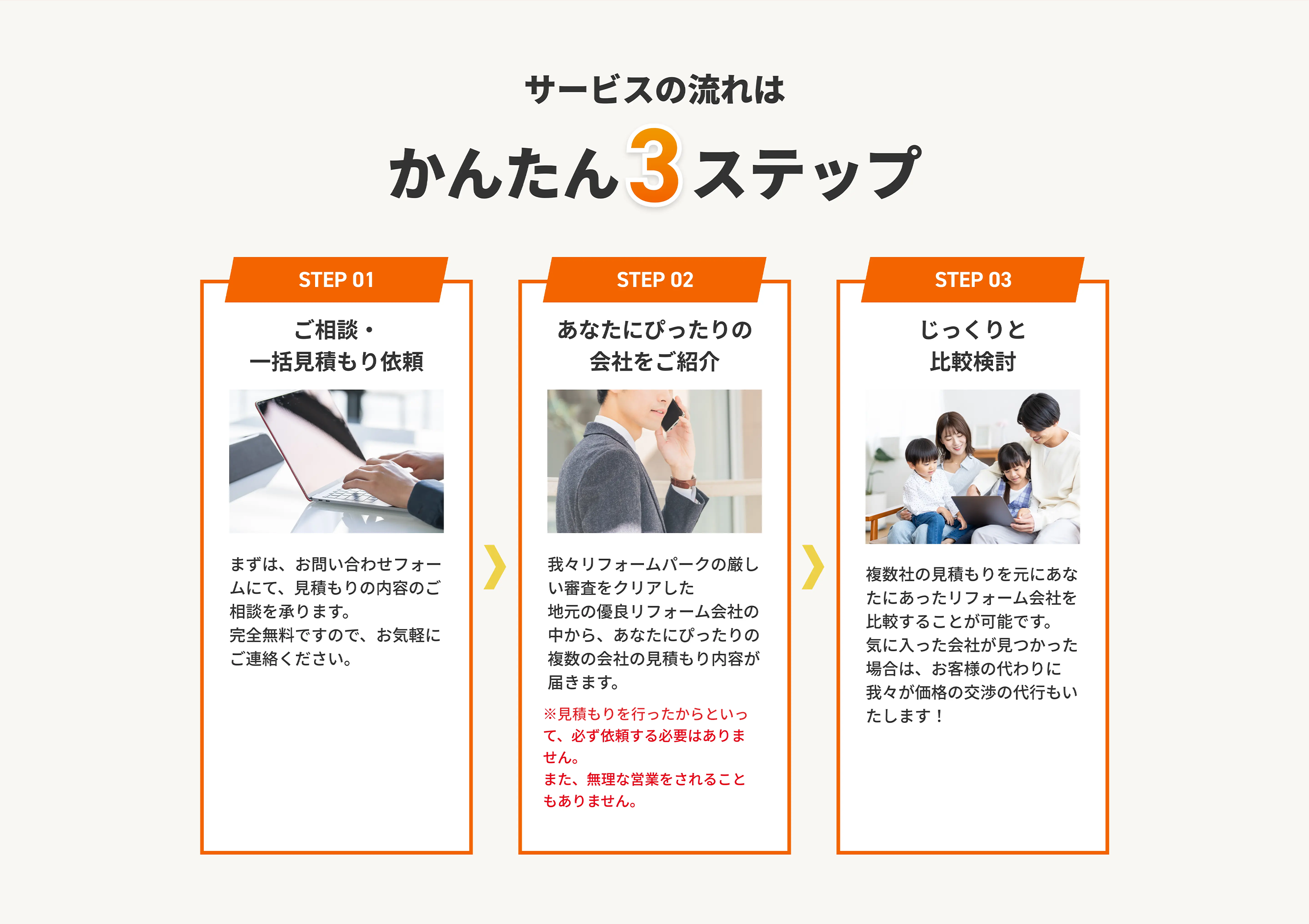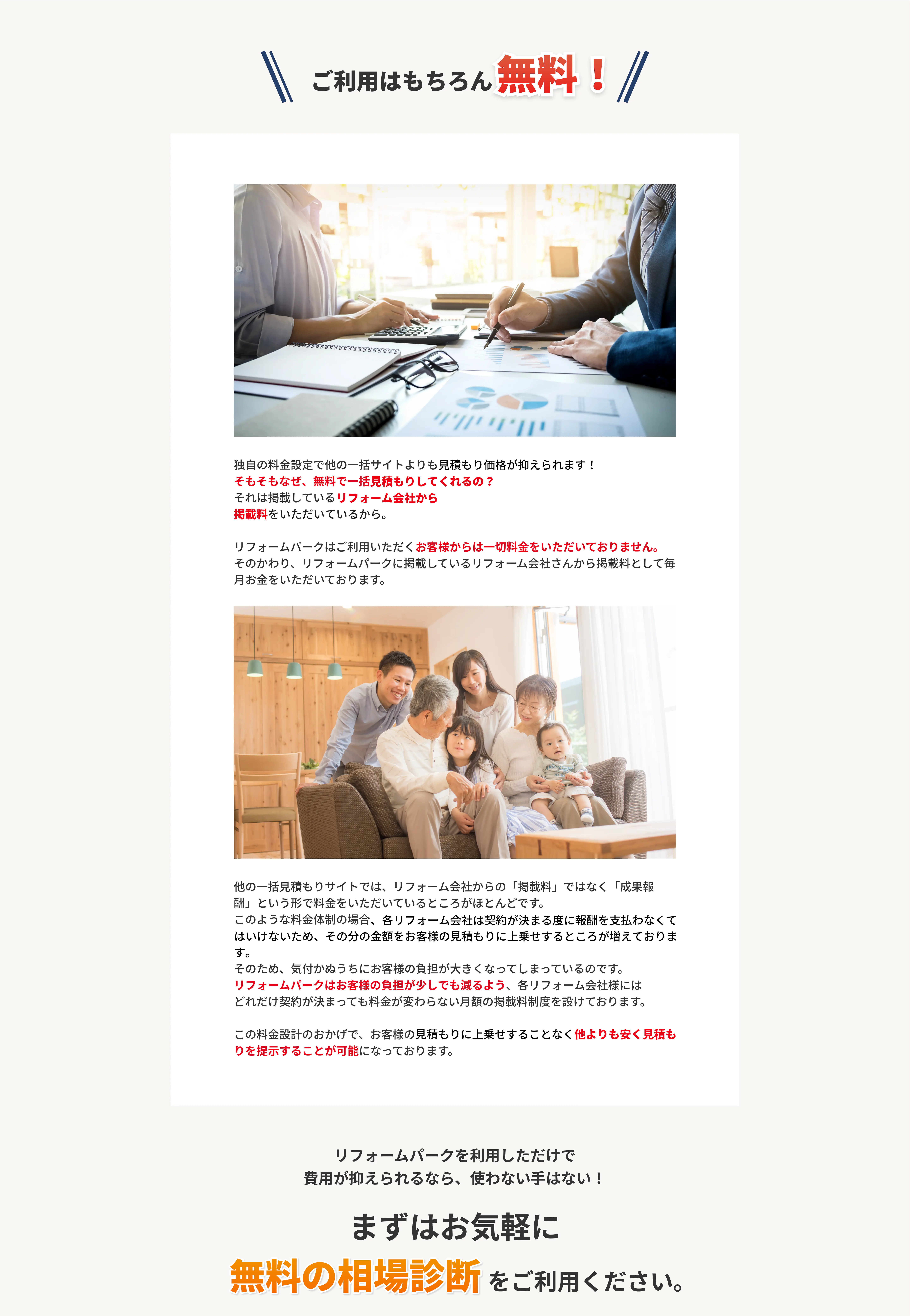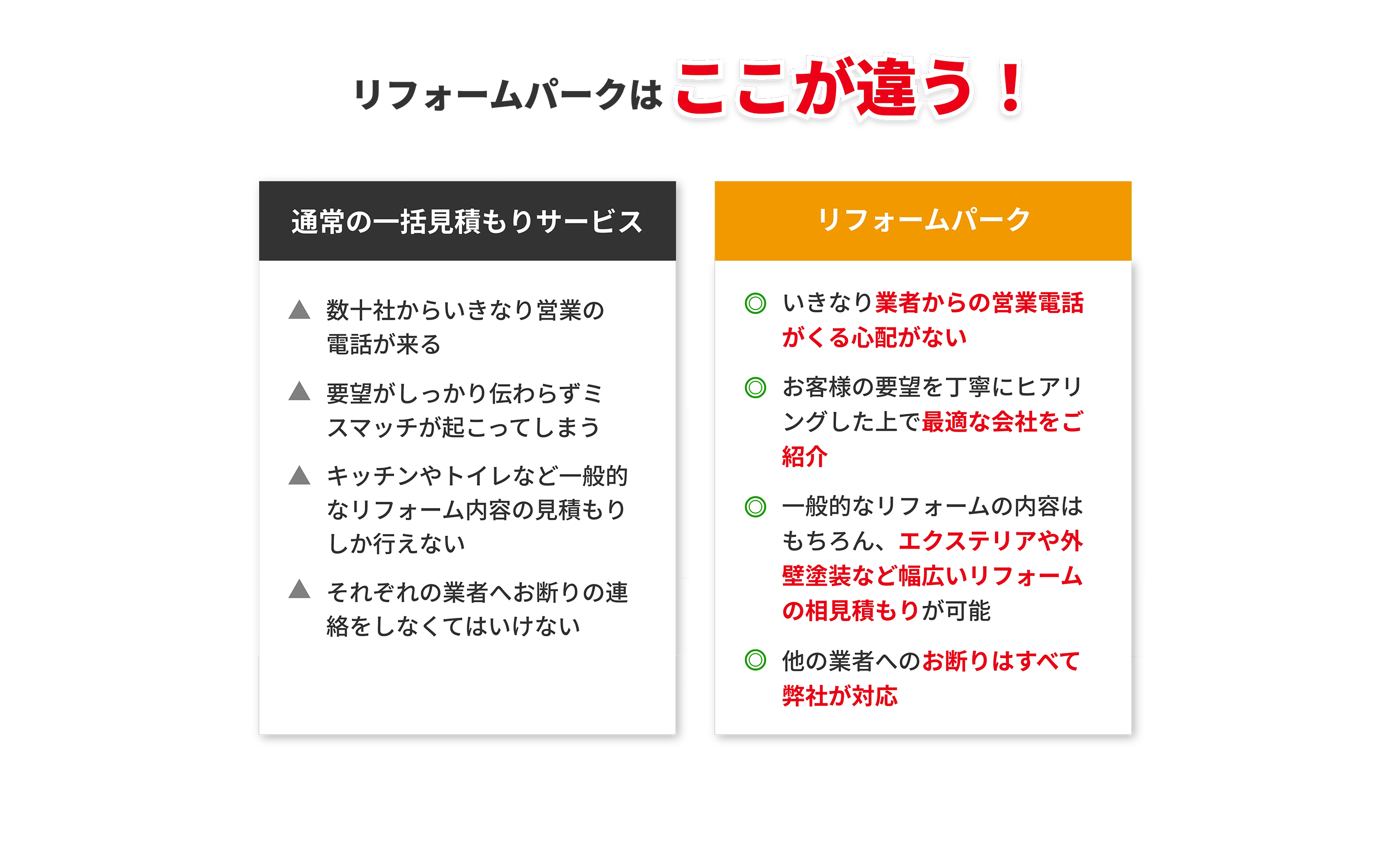 他の一括見積もりサイトの場合、各加盟会社は契約1件につき、成果報酬として利用料を支払っているのに対し、リフォームパークの場合は「月額」として定額で利用料をいただいております。そのため、各加盟会社は契約したから費用がかさんでいく、といったことがないため工事金額が変わる心配はありません。
