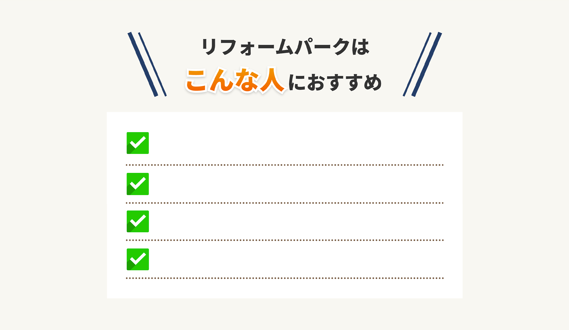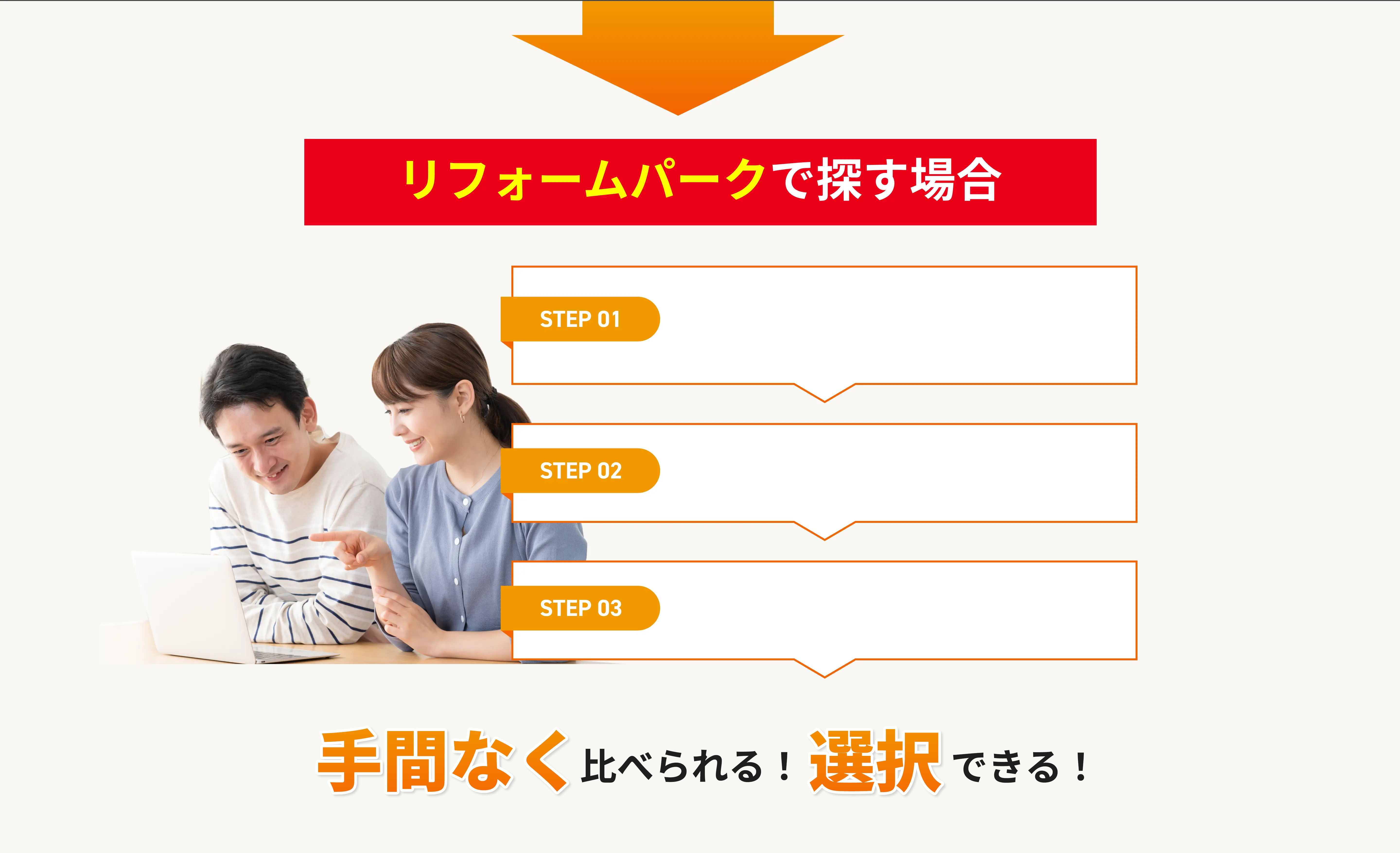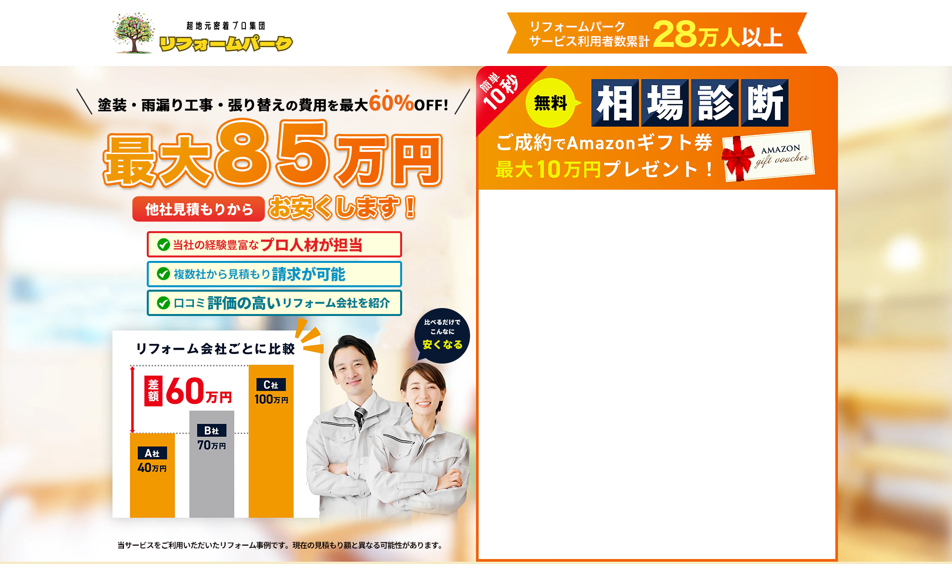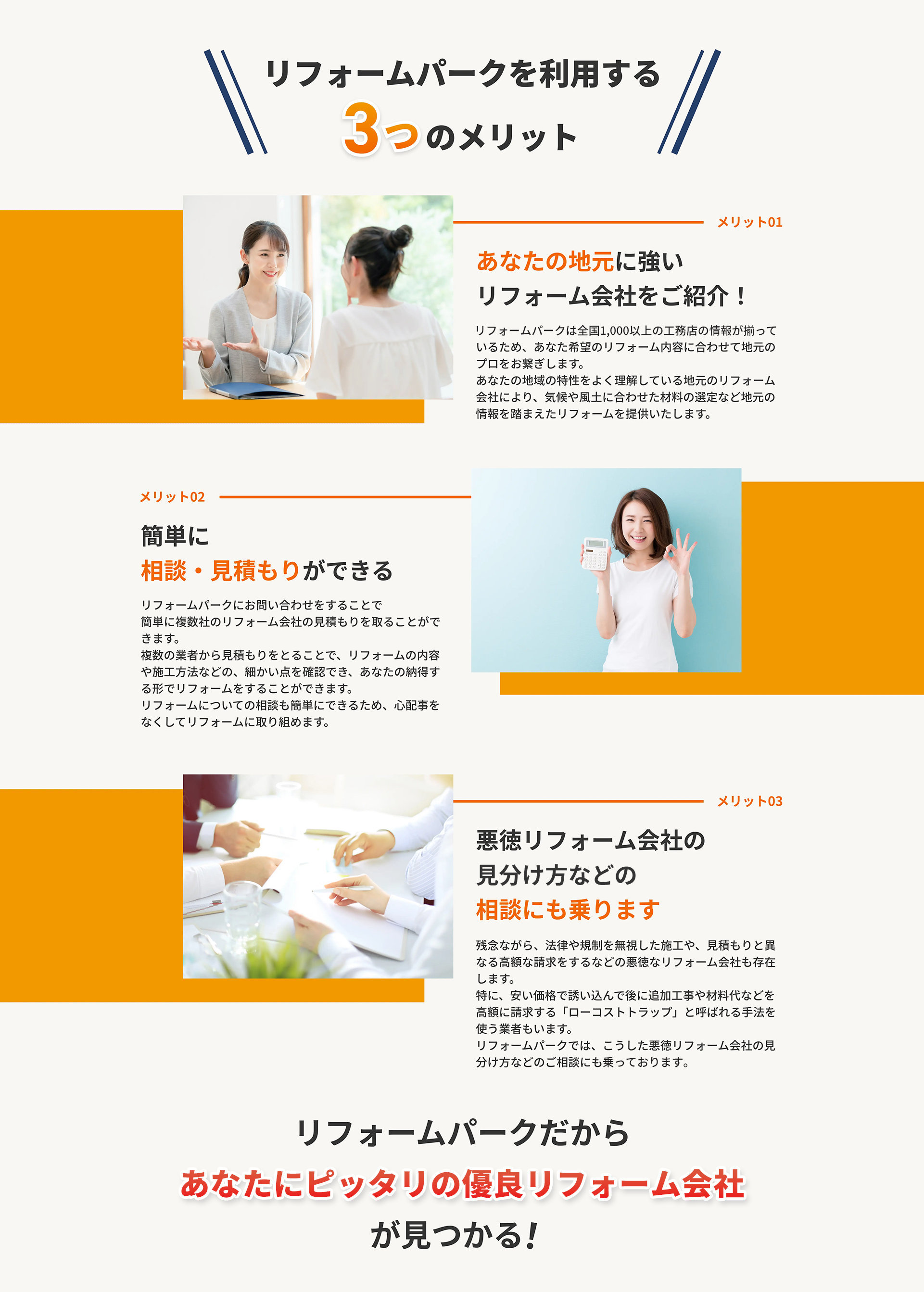 他の一括見積もりサイトの場合、各加盟会社は契約1件につき、成果報酬として利用料を支払っているのに対し、リフォームパークの場合は「月額」として定額で利用料をいただいております。そのため、各加盟会社は契約したから費用がかさんでいく、といったことがないため工事金額が変わる心配はありません。