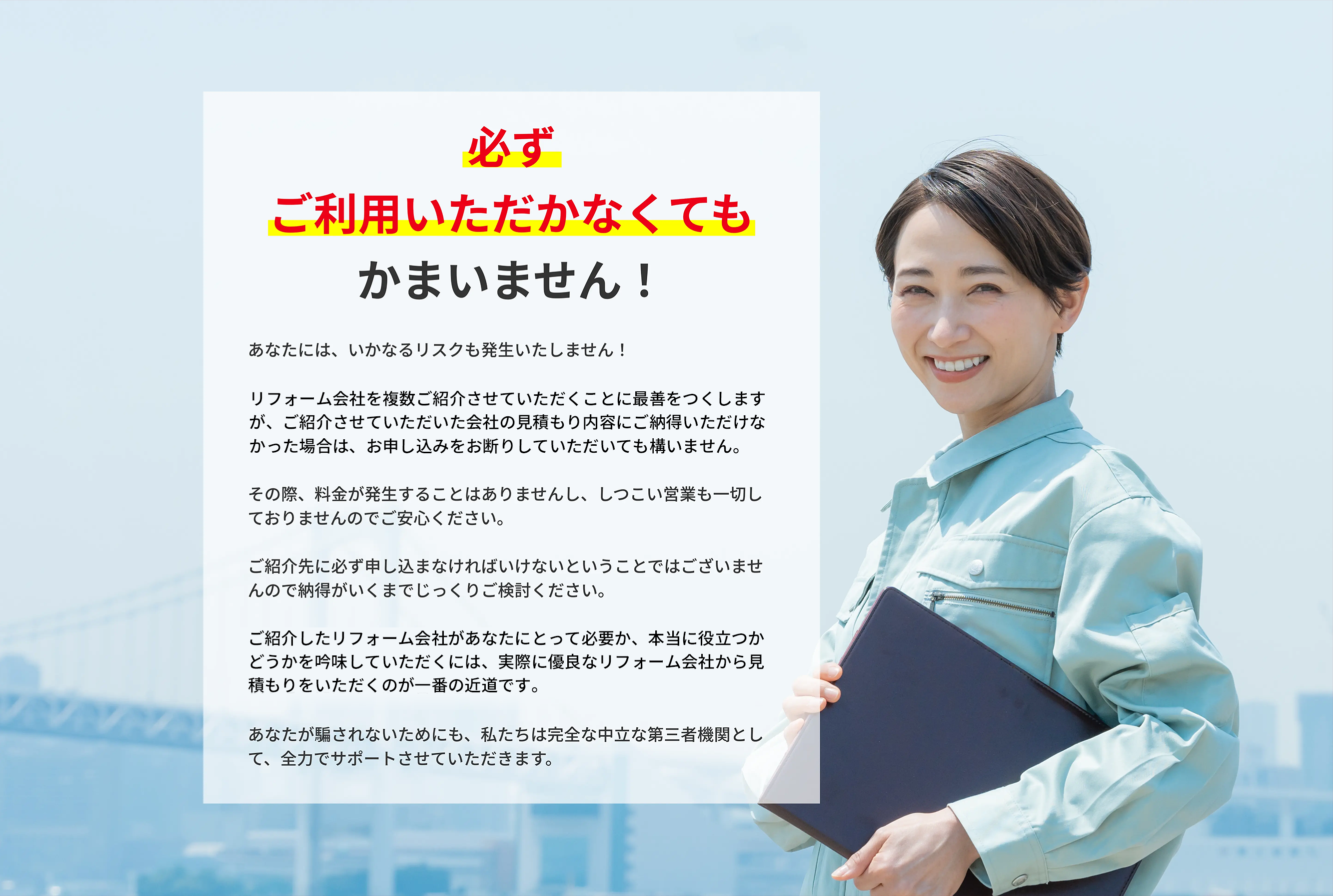 紹介した業者と必ず契約する必要もありませんので、ぜひお気軽にご相談ください。